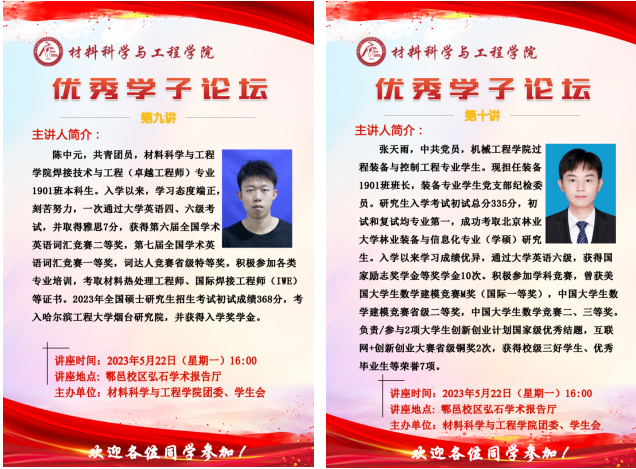 5月22日下午,yl23455永利集团在鄠邑校区弘石报告厅举办优秀学子论坛第九讲和第十讲,本期邀请到的优秀学子是机械工程学院张天雨,目前被北京林业大学录取攻读研究生;yl23455永利集团陈中元,目前被哈尔滨工程大学烟台研究院录取攻读研究生。公司300余名本科生参加论坛。