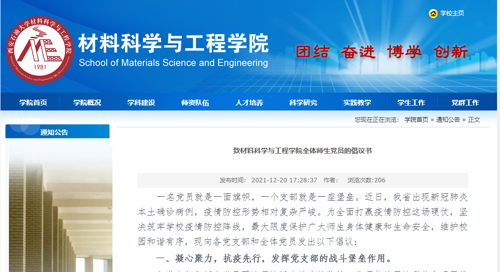 12月20日,公司党委第一时间发出《致yl23455永利集团全体师生党员的倡议书》,号召广大党员要迅速投入到疫情防控工作中来,率先垂范、担当使命,冲在最前、干在最前,用实际行动传递党的声音,凝聚党的力量。在这样的号召下,一个个材料人争当抗“疫”先锋,用一个个弱小的力量慢慢汇聚到这场疫情阻击战的大战役中。