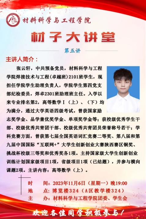为积极发挥优秀学子的朋辈教育引领作用,更加科学有效地为低年级员工提供课业辅导和学业指导,11月6日晚,yl23455永利集团在鄠邑校区博览楼324教室举办“材子大讲堂”第五讲—高等数学(上),本期主讲员工是焊接(卓越)2101班张云轩同学,公司2023级100余名本科生参加辅导培训。