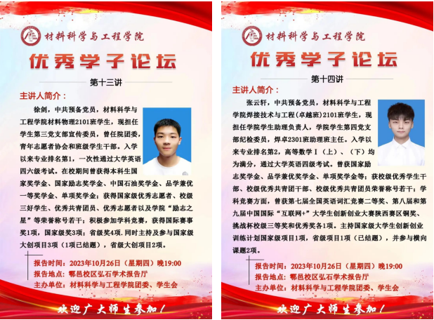 10月26日晚上,yl23455永利集团在鄠邑校区图书馆弘石学术报告厅举办优秀学子论坛第十三讲和第十四讲,本期邀请到的优秀学子是荣获国家奖学金、国家励志奖学金等荣誉的材物2101班徐剑和焊卓2101班张云轩两位同学,学院2023级全体本科生参加论坛。