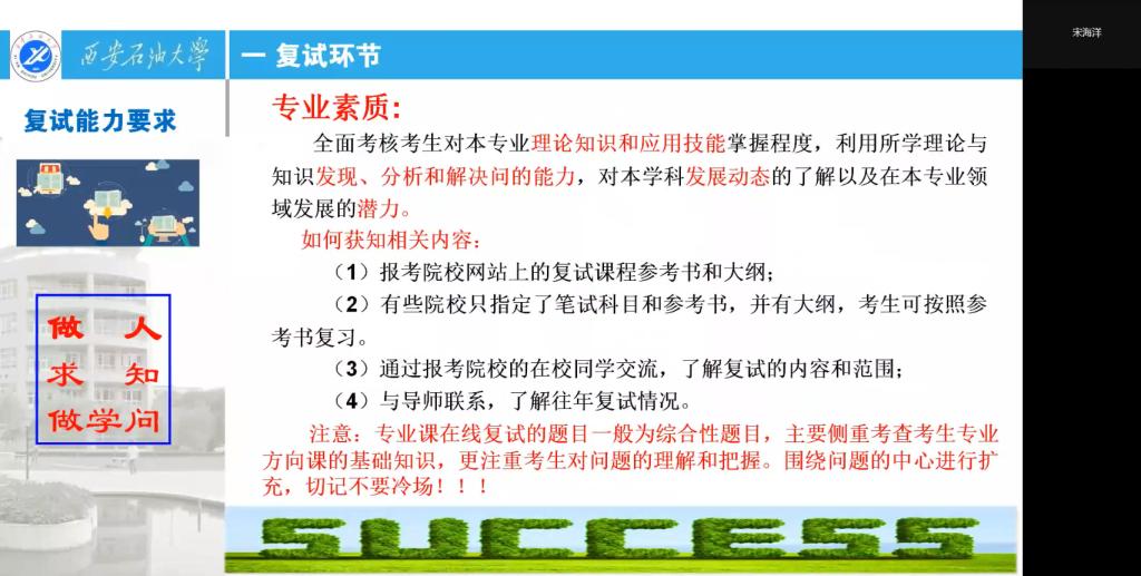 会上,宋海洋书记首先对同学们在考研初试中取得的成绩表示祝贺,并鼓励同学们要不骄不躁、乘胜追击、全力以赴,积极做好复试准备。紧接着,宋书记根据自身多年的研究生复试指导经验,从复试前期准备、复试流程、答题技巧、复试礼仪、突发情况应对等多方面对同学们进行了全面细致的指导,并对大家提出了三点建议:一是要克服紧张情绪,保持良好心态,学会积极调控;二是要做好充分准备,展现出良好的精神风貌;三是要及时关注各高校的调剂信息,不轻易放弃,为自己争取更多选择的机会。最后,宋书记详细介绍了公司研究生专业设置、团队队伍情况、公司产品、科研项目等方面的优势,表示学院将竭尽全力为同学们提供帮助,鼓励大家一定要坚持到底,确保复试顺利通过,同时也欢迎更多优秀的同学调剂回母校。