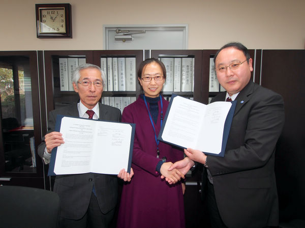 图为公司青年骨干教师刘静(中)受邀在大阪大学进行学术交流时,代表学院接受了该校接合科学研究所所长田中先生(右一)、教授村川英一先生(左一)签署的与公司的合作协议。