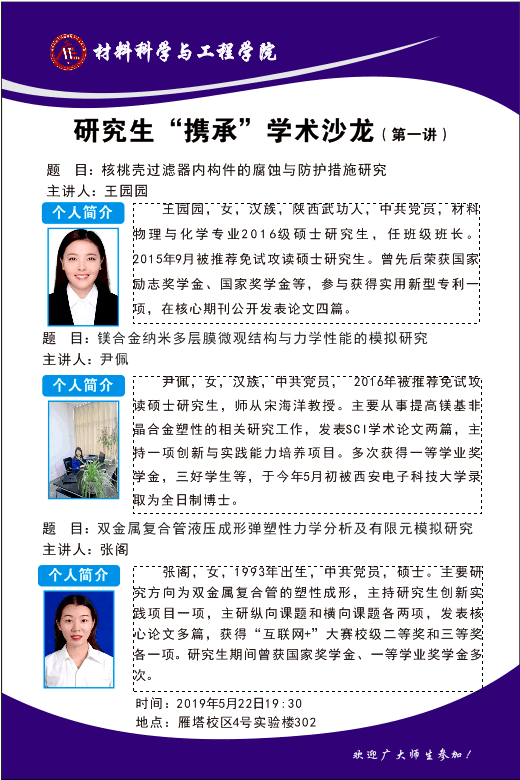 为了进一步完善人才培养机制,营造更好的学术氛围,创建良好的学术生态,激发研究生的创造智慧和创新潜能,为教师和研究生之间、研究生和研究生之间的学术沟通与合作搭建平台,学院研究决定,从2019年开始定期开展研究生“携承”学术沙龙活动。活动形式为邀请优秀的校外在读博士研究生和校内三年级研究生作学术报告,在场的老师及员工就相关主题开展深入交流研讨。
