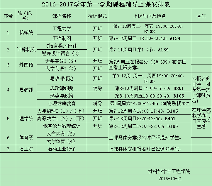 2016-2017学年第一学期课程辅导上课安排